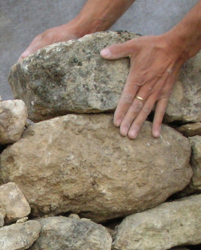 La technique est celle du geste, de la compréhension de chaque pierre, de l’usage spécifique que l’on en fera. A ce stade très peu d’outils sont utilisés : la massette pour enfoncer une pierre et le têtu pour « raboter », enlever des imperfections. Le murailleur travaille en même temps avec force et méticulosité, avec patience comme dans un jeu de construction.