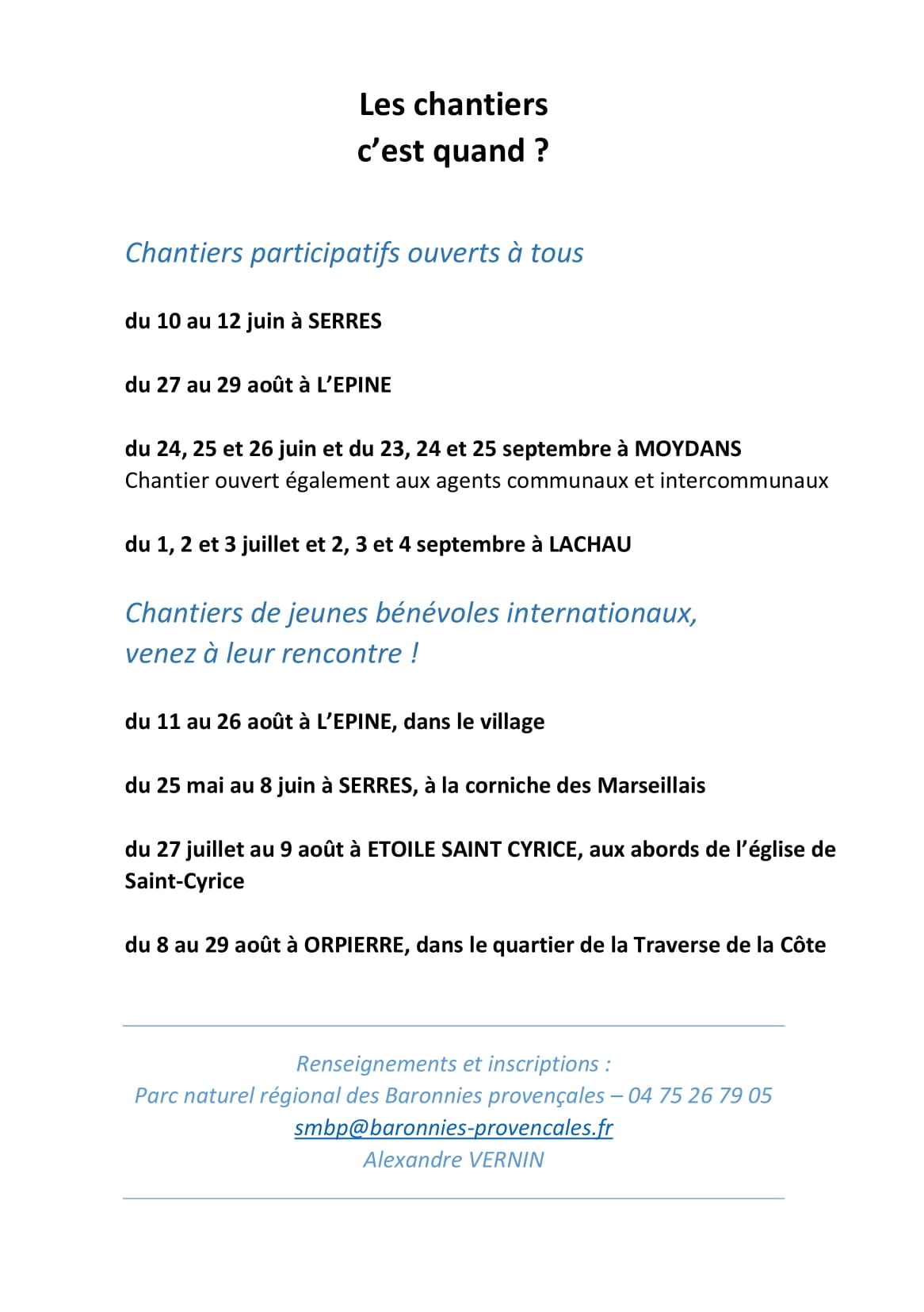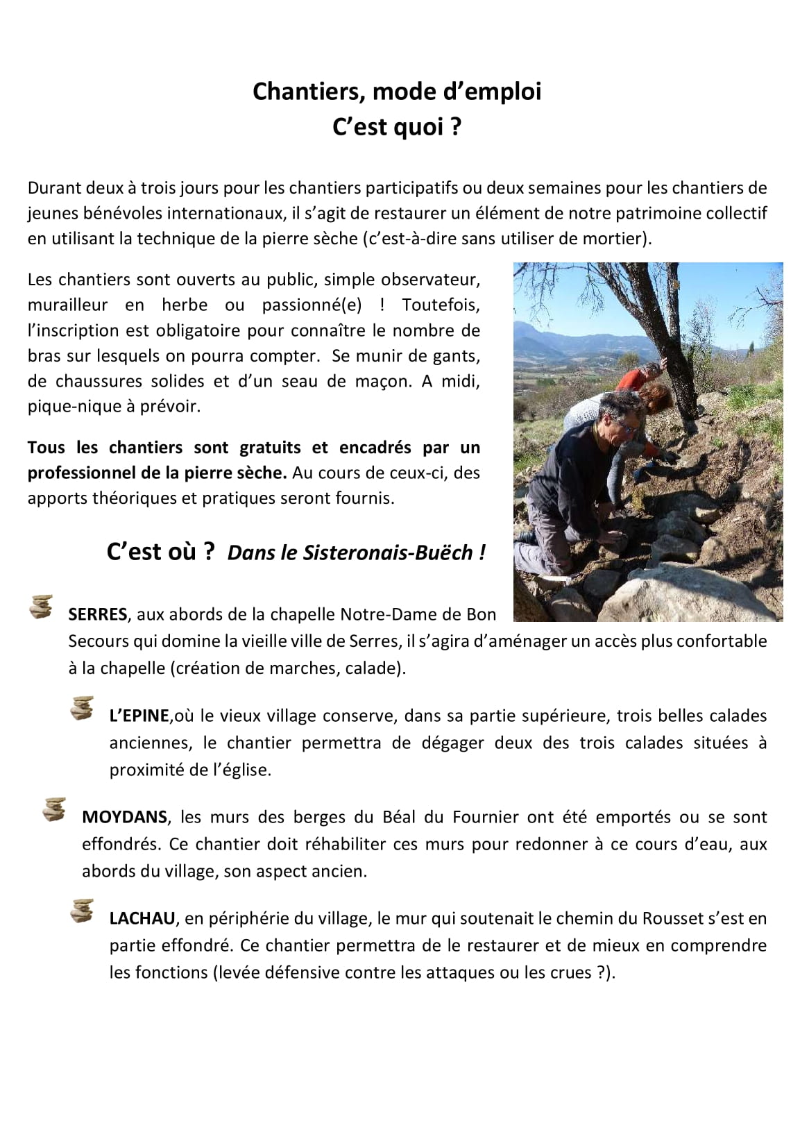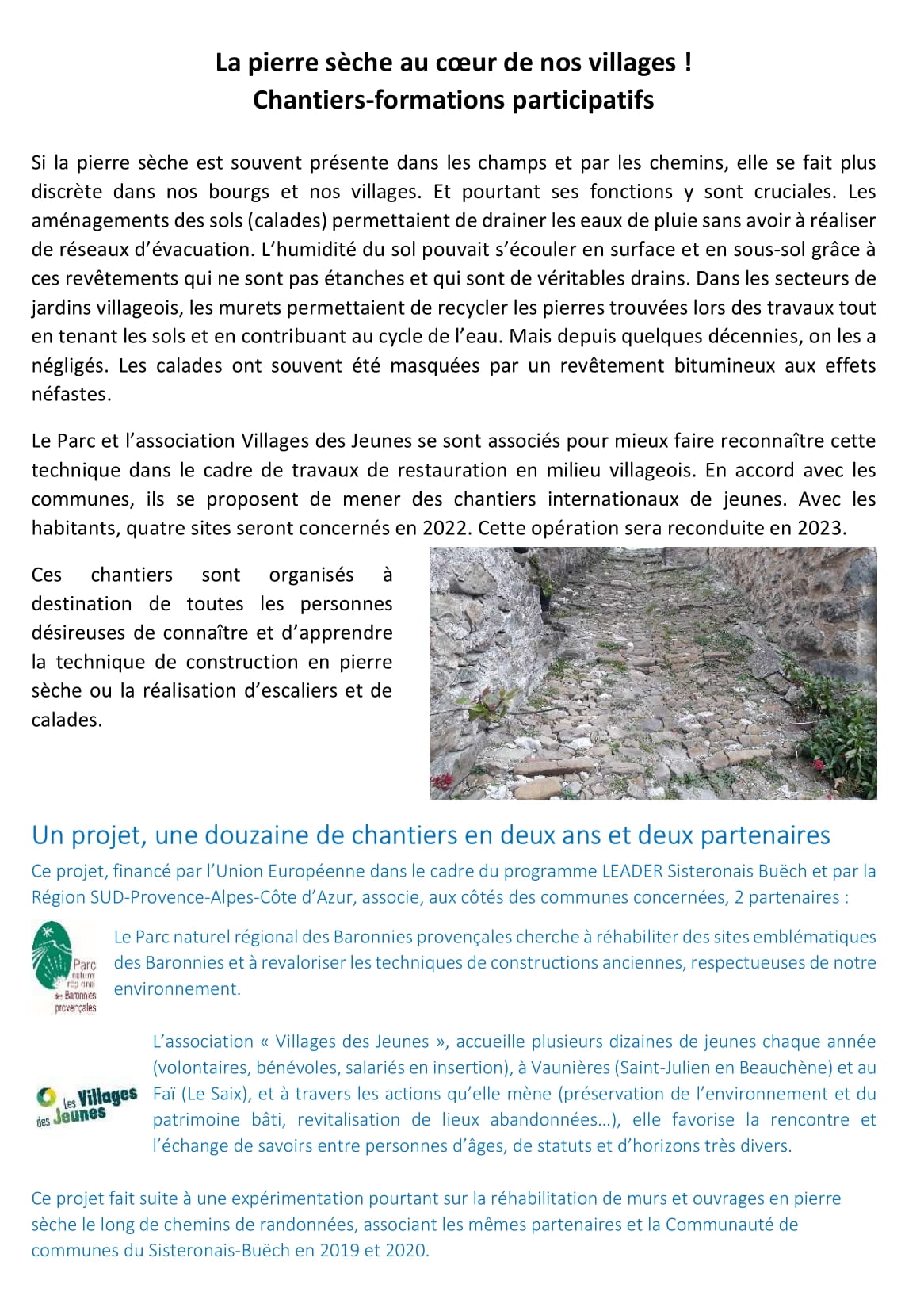 Voici le calendrier des chantiers participatifs pierre sèche proposés par le Parc naturel régional des Baronnies provençales et Villages des Jeunes pour la saison 2022 dans le cadre du programme : La pierre sèche au cœur de nos villages.