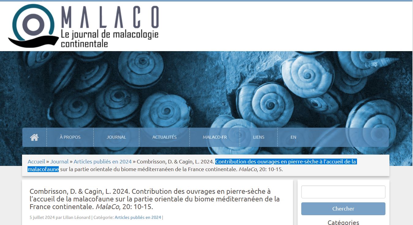Combrisson, D., Cagin, L., « Contribution des ouvrages en pierre-sèche à l’accueil de la malacofaune sur la partie orientale du biome méditerranéen de la France continentale », Malaco, le journal de la malacologie continentale, publication en ligne, juillet 2024.