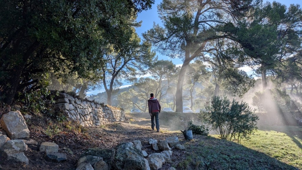 L’intitulé de la formation donne la couleur, Ouvrier Professionnel en Restauration du Patrimoine. J’y interviens avec les stagiaires depuis 2009 à Meyrargues (Fr-13) sur le patrimoine en pierre sèche de la mairie, et depuis presque une décennie sur l’oliveraie historique du château.