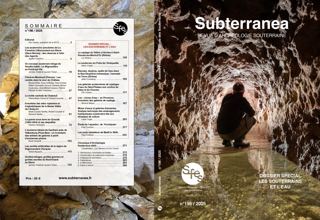 Nous sommes heureux de vous annoncer la sortie du numéro 196 de la revue Subterranea au sein de laquelle nous avons publié un article nommé « Analyse technique des aménagements hydrauliques souterrains liés aux terrasses de culture« .